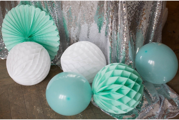 Микс из 4-х шаров-сот разного диаметра (40см и 30см) нежно-голубого и белого цвета в стиле «tiffany». Просто находка для декорирования праздника или фотозоны.